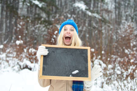 Cheerful man in santa claus hat, bearded hipster with beard and moustache covered with white frost, points at black board or chalkboard with winter word on sunny day outdoors on natural background