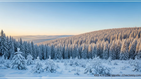 Peaceful winter scene with snow-covered pine trees and misty hills in the background