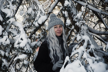 blonde woman rejoices in winter in a snowy forest in the afternoon.