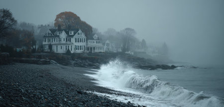 A large white house sits on a coastline as large waves crash during a storm. The color palette is muted with shades of gray and blue. The scene is enveloped in mist, creating a moody atmosphere. This image could be suitable for editorial content or various commercial applications.