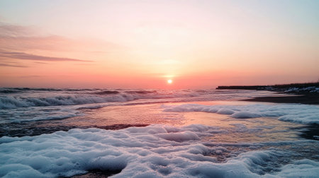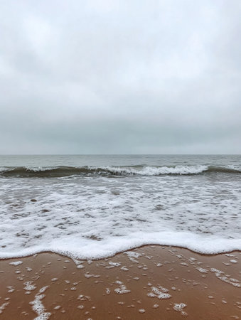 A tranquil seascape features soft waves lapping against a sandy shore under a foggy sky, evoking a sense of peace and natural beauty at the ocean.