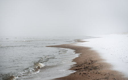 A view of snow-covered sandy sea shore in a thick fog. Atmospheric monochrome landscape. Nature, environmental conservation, ecology, winter, climate change, global warming