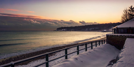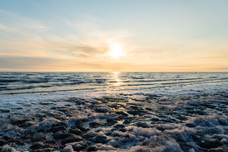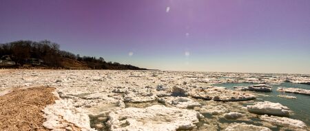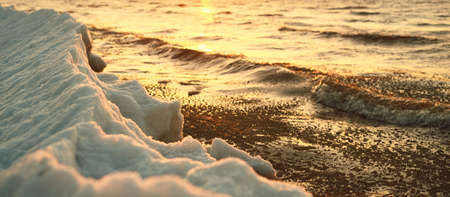Panoramic view of the snow-covered shore of the frozen Baltic sea at sunset. Water surface texture. Christmas, seasons, winter