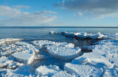 spring landscape from the lake shore, white ice cubes, blue sky, Lake Burtnieki, Latvia.