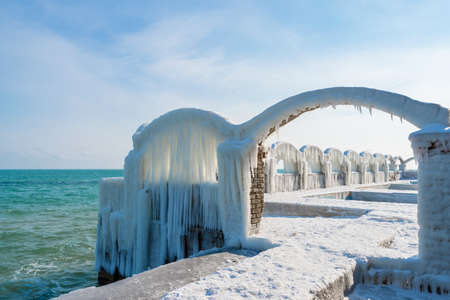 Pier ice accretion under gale with wind combed icicles representing extreme maritime winter suitable for weather features infrastructure stories and dramatic design