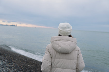 Winter beach scene with a person in a padded hooded coat standing on a pebbled shore, facing the sea under an overcast sky and calm horizon, minimalist and contemplative.