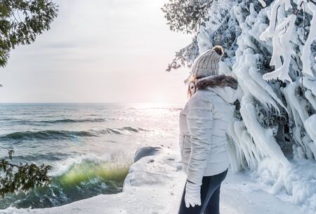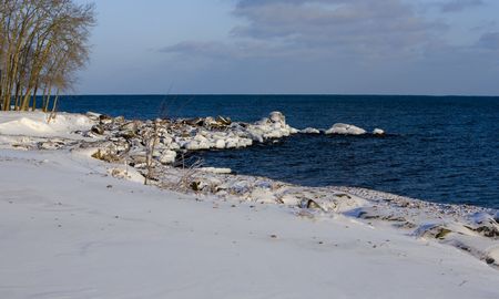 Winter landscape with frozen sea and icy beach. Dramatic seascape. Storm and snow weather.