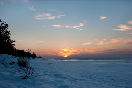 Beautiful sunset over the snowy sea on a frosty weather. Icy boulders along the shore.