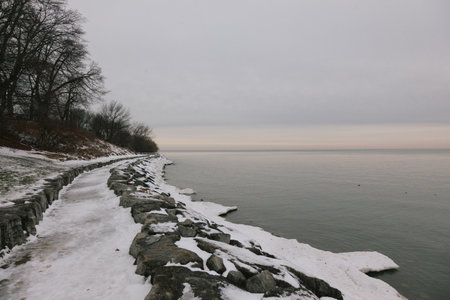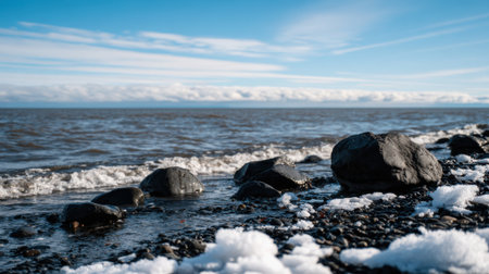 A picturesque snowy beach scene featuring a tranquil and expansive body of water in the background, creating a serene atmosphere