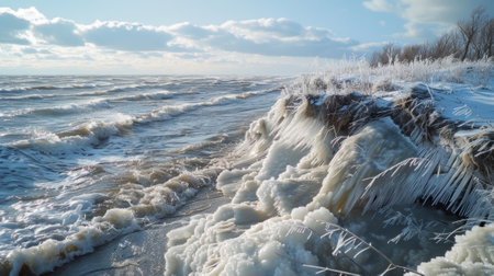 A quiet beach on a chilly winter afternoon features frozen waves and shimmering ice along the shoreline, surrounded by bare trees and clouds drifting by.