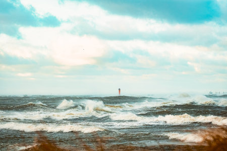 Lighthouse on the sea during Stormy weather in Riga, Latvia. Huge waves crashing down the coast