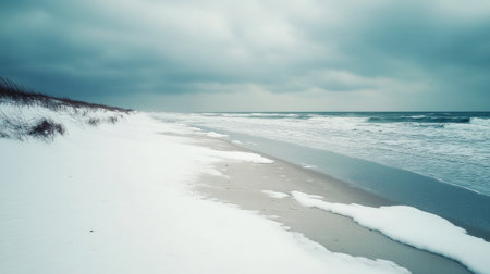 A serene beach in winter, the sand covered in a blanket of snow, waves lapping at the shore, with a dramatic overcast sky creating a tranquil atmosphere.