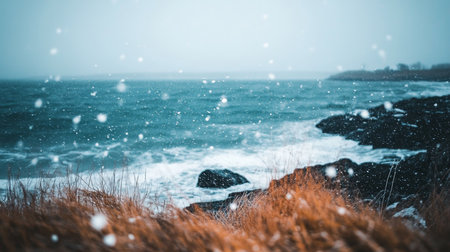 Nordic Winter Seascape Snow Falls on a Windswept Coastline with Dramatic Waves and a Moody Sky