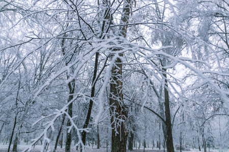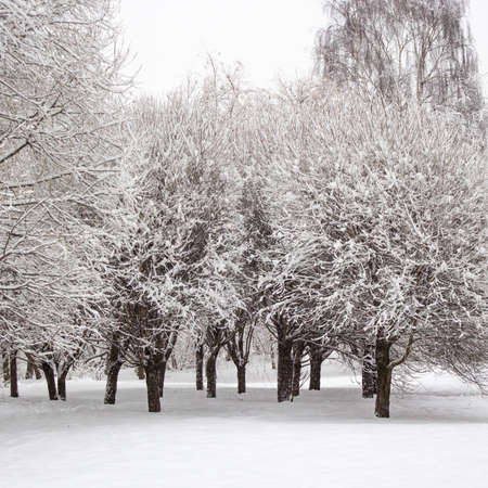 Winter landscape. Trees in the park during a heavy snowfall.
