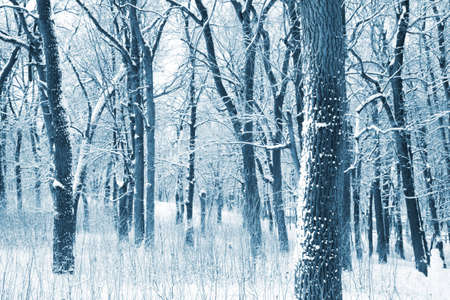 Trees in winter forest in snowfall time