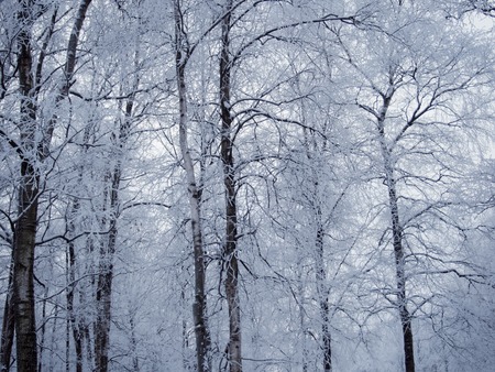Low angle view of the birch forest after a blizzard, tree trunks close-up. Hoar frost on branches. Clear blue sky. Warm sunlight. Latvia