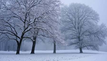 Two prominent oak trees, their branches thick with snow and frost, stand in a quiet, snow-covered field under a muted, hazy sky.