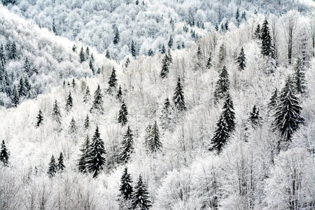 Hoar frost on trees in winter, frozen forest and white snow at mountains