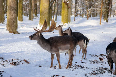 A group of wild fallow deers resting in the garden of medieval Castle Blatna in winter sunny day, Herd of red deer in its natural enclosure in the forest, Czech Republic, January 09, 2021