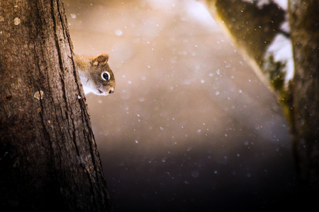 A beautiful closeup of a squirrel on a snowy tree in winter