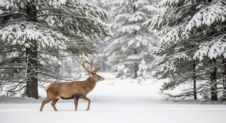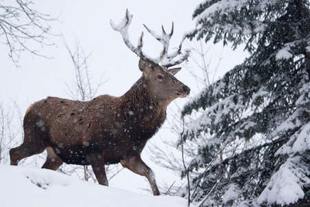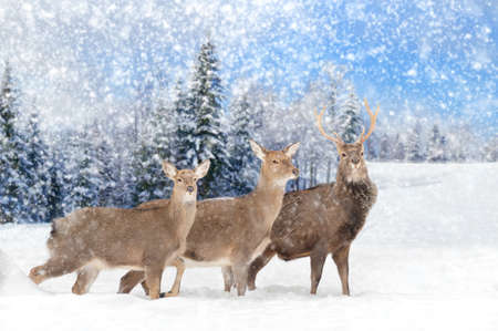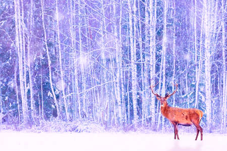 Noble deer against winter snowy forest. Artistic fairy Christmas. Winter seasonal image