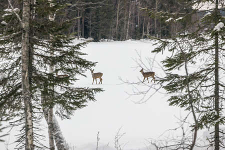 Female roe deer in the winter forest. Animal in natural habitat. Wildlife scene
