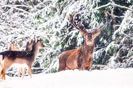 Deer with large Horns with snow looking at camera during snowfall. Winter wildlife Christmas landscape with noble deers in natural habitat