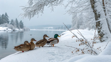 Winter portrait of a duck in a winter public park. Duck birds are standing or sitting in the snow. Migration of birds. Ducks and pigeons in the park are waiting for food from people.