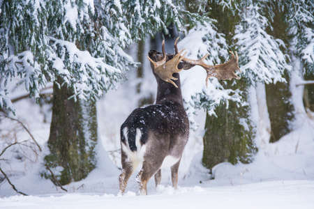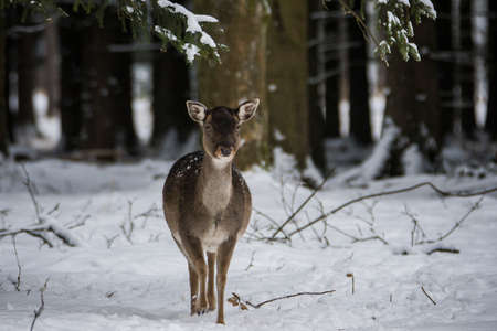 Winter wildlife landscape with young deer in Black Forest, Germany.