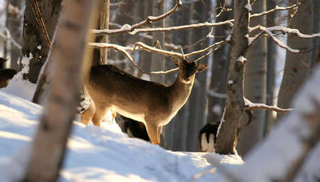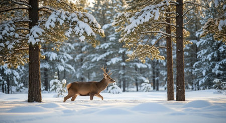 Deer standing on snow-covered ground in a winter forest during sunset. Concept of wildlife, nature, winter season, animals in their natural habitat.