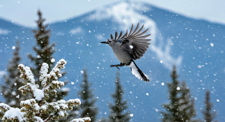 A small thrush bird rests on a snow-covered pine branch in the winter. Snowflakes gently fall around it.