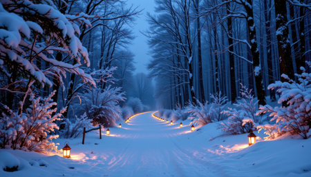 A serene winter pathway illuminated by glowing lanterns, surrounded by snow-covered trees, captures the tranquil beauty of the snowy landscape during dusk.