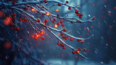 A serene winter scene featuring snow-covered branches adorned with vibrant red berries against a dreamy blue backdrop, capturing the magic of the season.