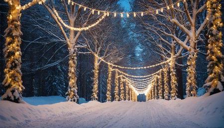 A beautiful winter road lined with illuminated trees, creating a magical and festive atmosphere as the lights glow against the snowy landscape, perfect for seasonal photography and holiday-themed projects.