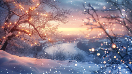Tranquil winter evening with snowfall and distant city lights background
