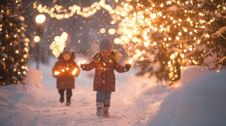Two children run through a winter wonderland, grinning as they wave sparklers. The snowy path glows with festive lights, creating a magical atmosphere perfect for holiday celebrations.