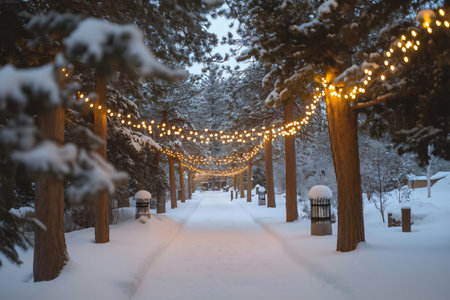 A serene winter scene featuring a snow-covered pathway lined with illuminated trees and festive string lights.