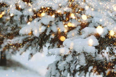 Christmas background with bokeh lights and fir tree branches covered with snow