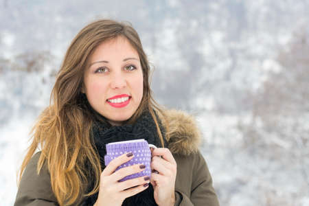 Young woman drinking hot coffee in winter forest. Portrait of beautiful girl in knitted sweater and black hat.