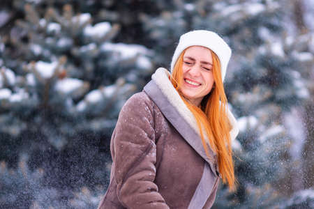 Winter girl throwing snowball at camera smiling happy having fun outdoors on snowing winter day playing in snow. Cute playful redhead ginger young woman outdoor enjoying first snow.