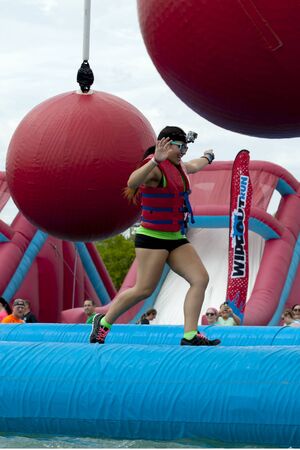 Woman running at the wrecking balls water obstacle at the Wipeout 5K Run obstacles course in Wilmington Delaware The Wipeout Run is themed after the popular ABC game show Wipeout and has12 obstacles. Some of the obstacles incorporated in the course ar
