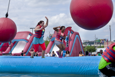 Woman falling at the wrecking balls water obstacle at the Wipeout 5K Run obstacles course in Wilmington Delaware The Wipeout Run is themed after the popular ABC game show Wipeout and has12 obstacles. Some of the obstacles incorporated in the course a