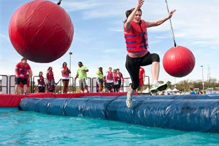 Atlanta, GA USA - April 5, 2014 A woman begins to slip and fall into the water trying to run through the wrecking balls event, at the Ridiculous Obstacle Challenge ROC 5K race