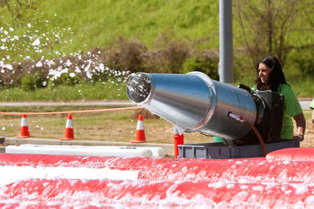 Atlanta, GA USA - April 5, 2014 A young woman operates a large bubble machine to fill the foam pit with soap suds, at the Ridiculous Obstacle Challenge ROC 5K race