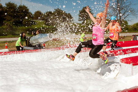 Atlanta, GA USA - April 5, 2014 Young women get sprayed with bubbles jumping into a huge foam pit, as they take part in the Ridiculous Obstacle Challenge 5k race