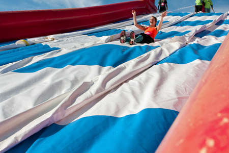 Atlanta, GA, USA - April 5, 2014 A young woman laughs and screams while sliding down a watery slide in the Ridiculous Obstacle Challenge ROC 5K race