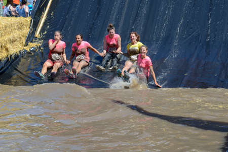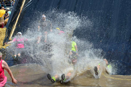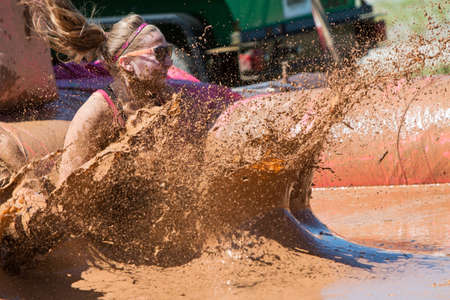 Hampton, GA, USA - April 23, 2016: A woman creates a large splash of muddy water as she lands in a mud pit at the Dirty Girl Mud Run obstacle course event on April 23, 2016 in Hampton, GA.
