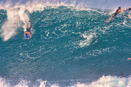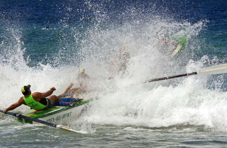 Surfboat crew almost loosing it while splashing through the first line of surf