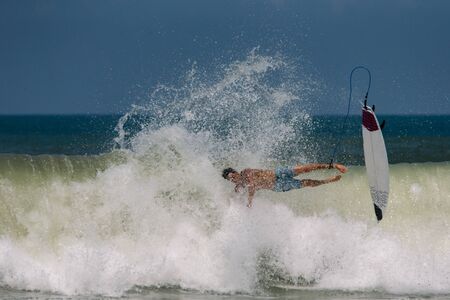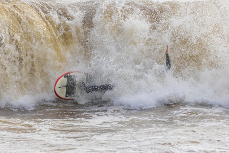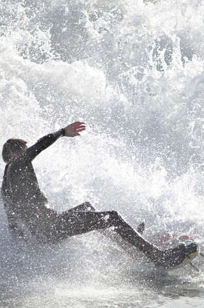 Surfer falling in the water. Blurred in motion photo. Big wave and spray.