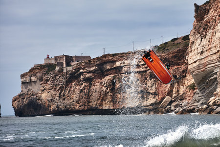 Professional jet ski riders compete at the IFWA World Tour Jet Ski Championship. Contestants perform tricks for judges in the waves. Freeride World Championship IFWA. 27.04.2018, Nazare, Portugal
